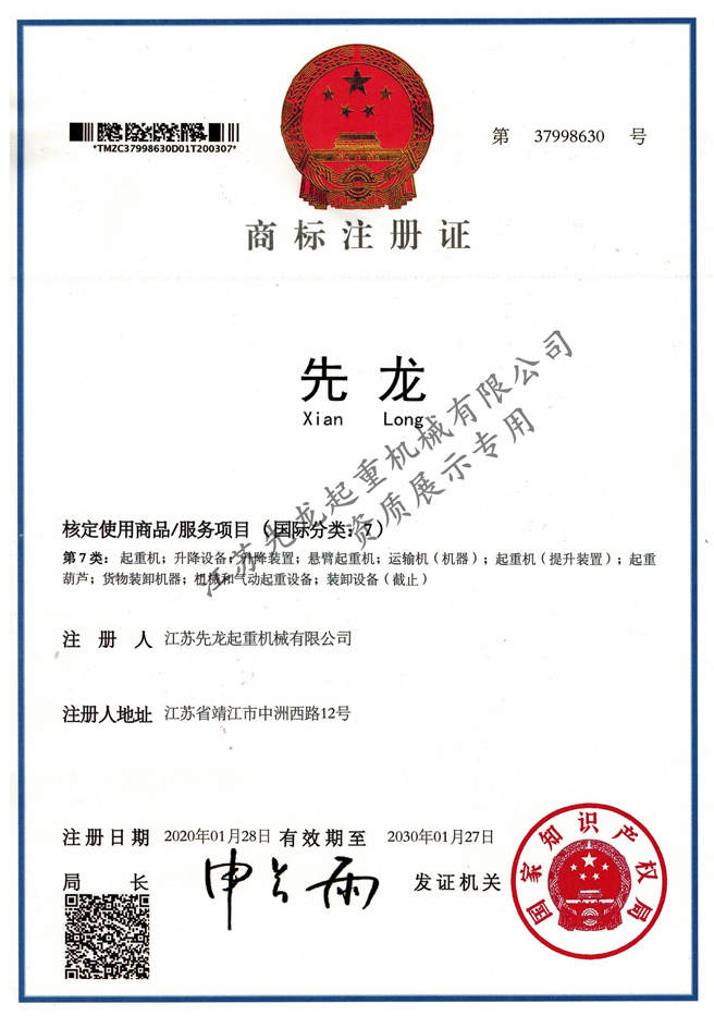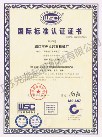 江蘇先龍起重機械有限公司(原靖江市先龍起重機械廠)是改制后的獨資企業,本廠是生產起重運輸機械的專業化企業,并先后通過了ISO9001:2000質量管理體系認證、獲得國家頒發的HGQ50T固定式起重機和DLQ20T輪胎式起重機的特種設備制造許可證、特種設備安裝維修改造許可證。